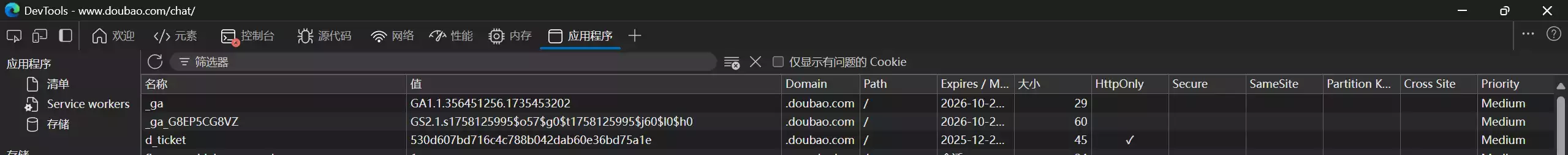 用户可通过 f12打开控制台,然后应用->Cookie->找到当前地址,就能看到当前的Cookie 信息。