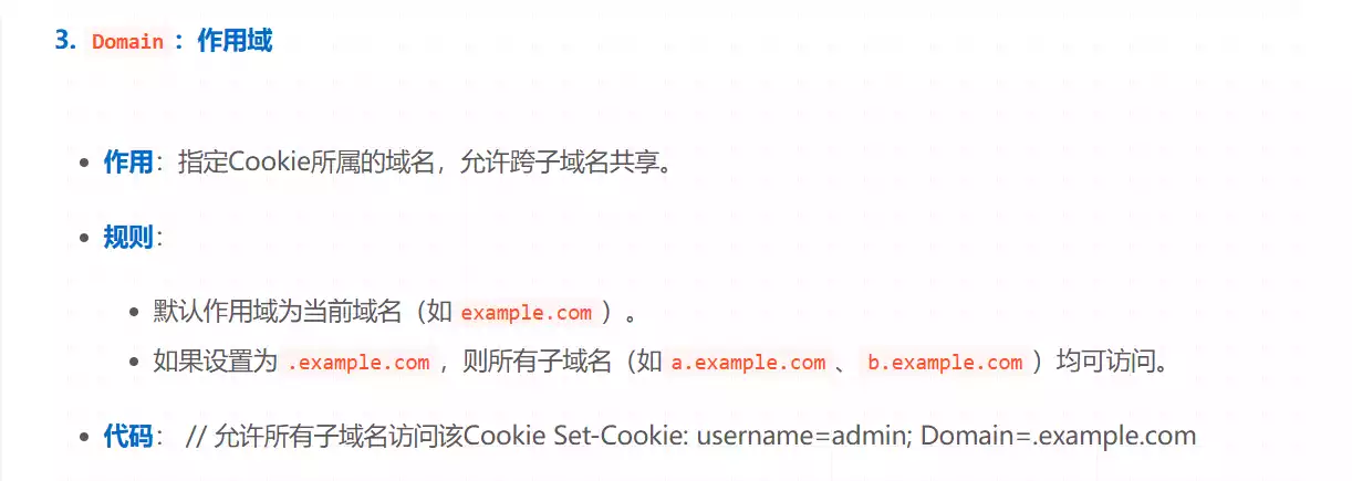 : 作用域,指定Cookie所属的域名,允许跨子域名共享