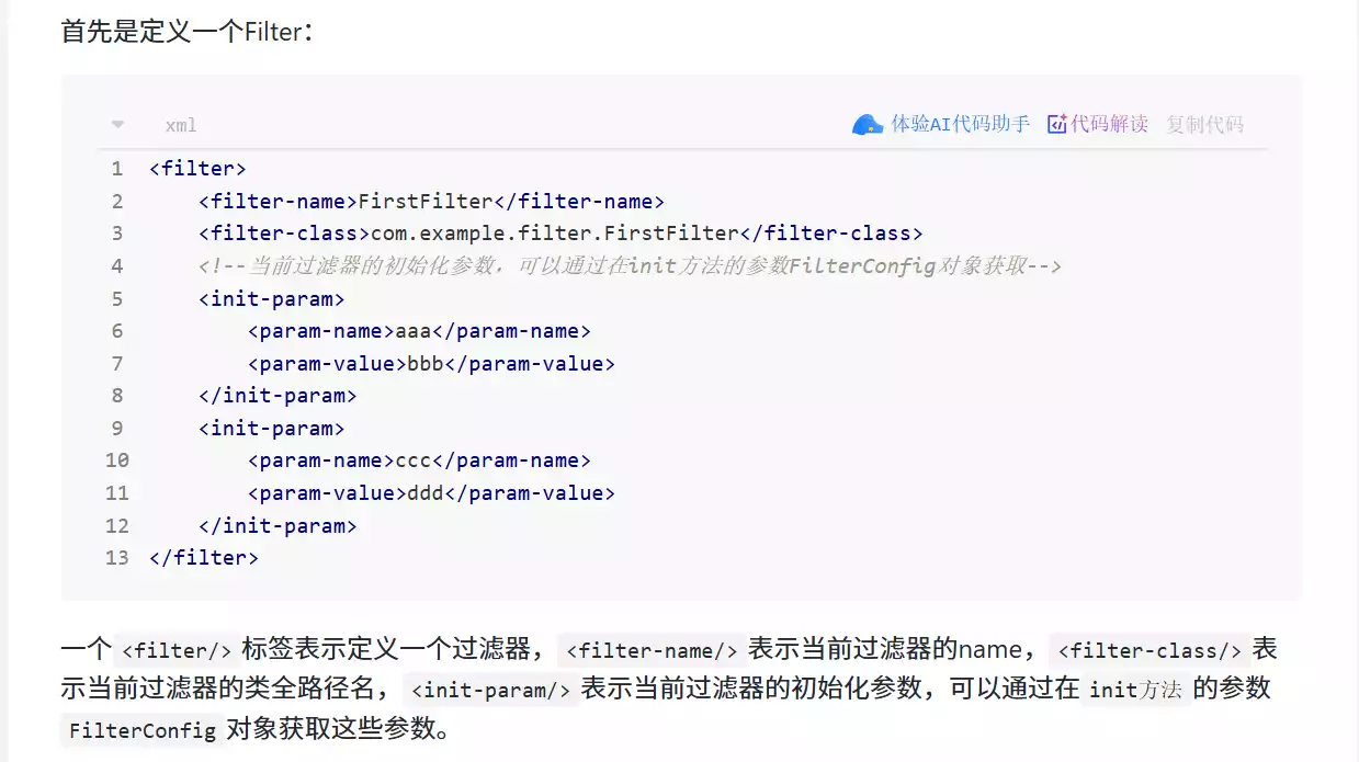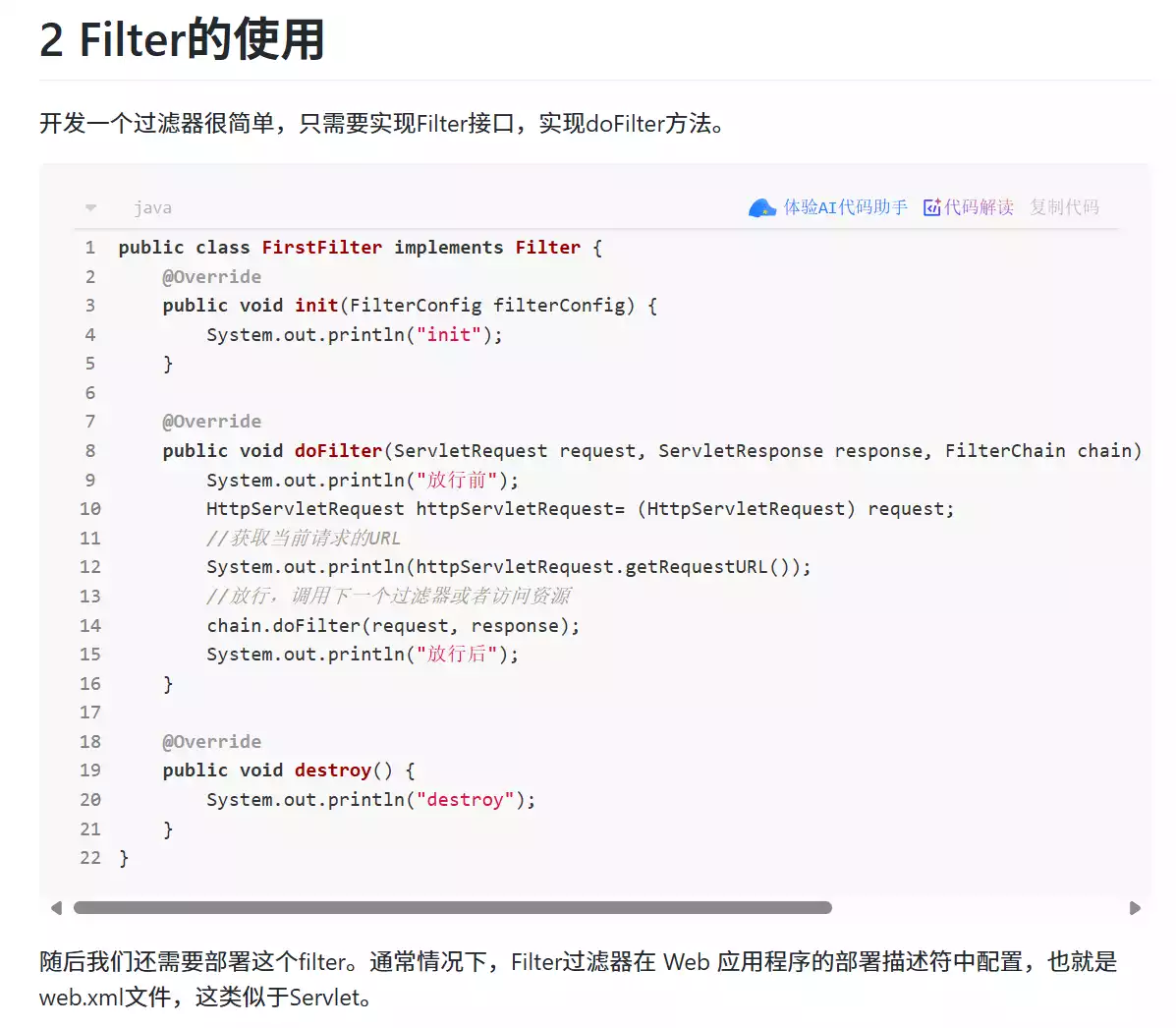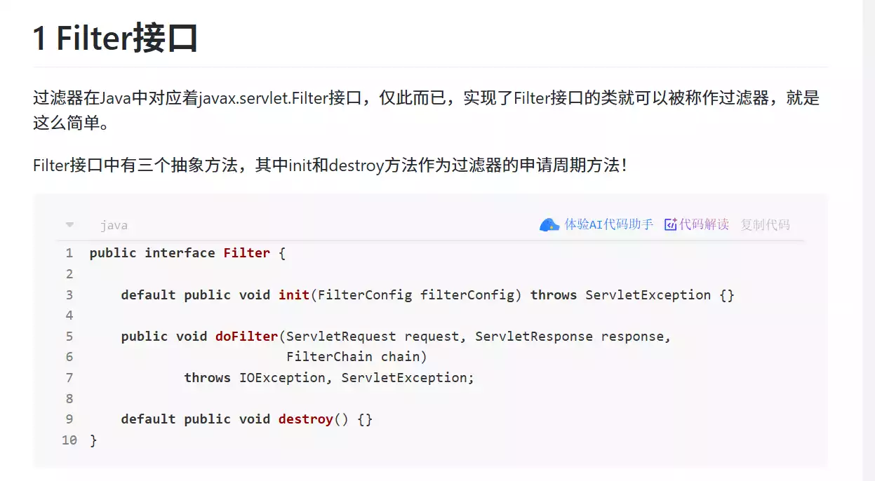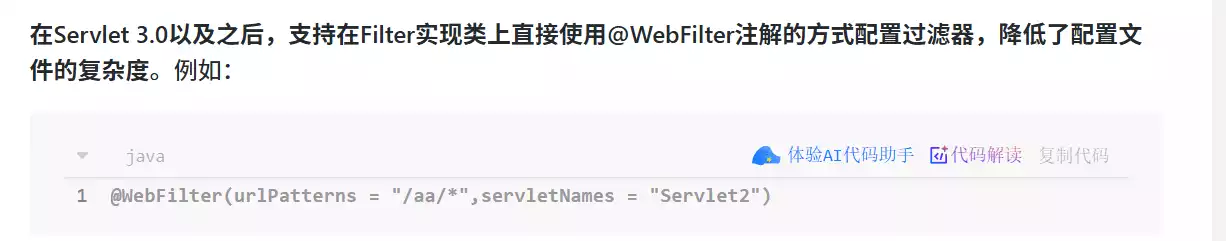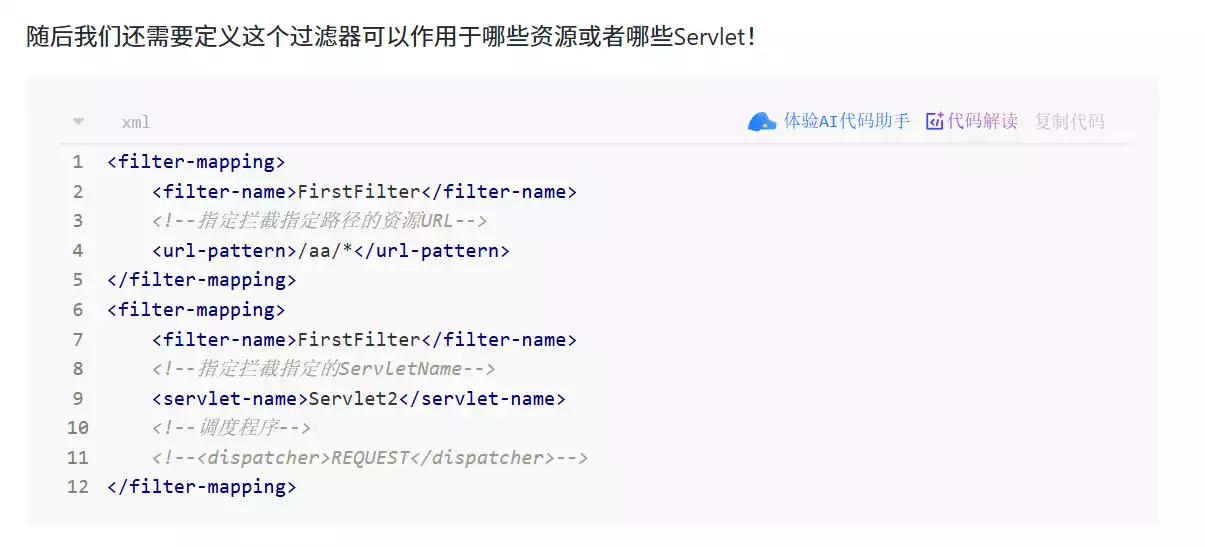 @Bean// 这样配置可以指定过滤器的执行顺序 public FilterRegistrationBean<MyFilter1> myFilter1() { FilterRegistrationBean<MyFilter1> filter = new FilterRegistrationBean<>(); filter.setFilter(new MyFilter1()); filter.addUrlPatterns("/*"); filter.setOrder(1); return filter; }
