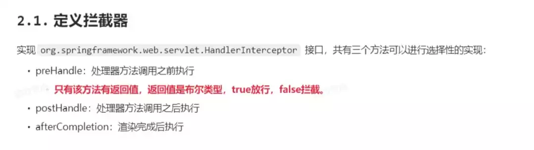 @Override//目标资源方法执行前执行。 返回true:放行 返回false:不放行 public boolean preHandle(HttpServletRequest request, HttpServletResponse response, Object handler) throws Exception {